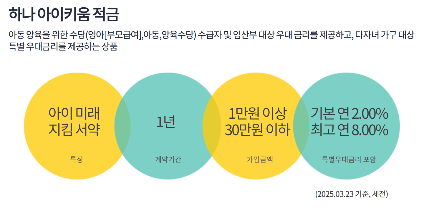 하나은행은 '하나 아이키움 적금'이 마련되어 있습니다.