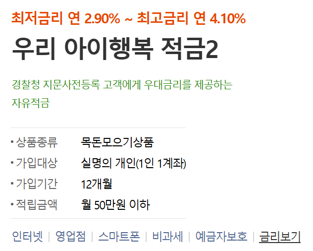 우리은행에는 '우리 아이 행복 적금2' 상품이 마련되어있습니다.