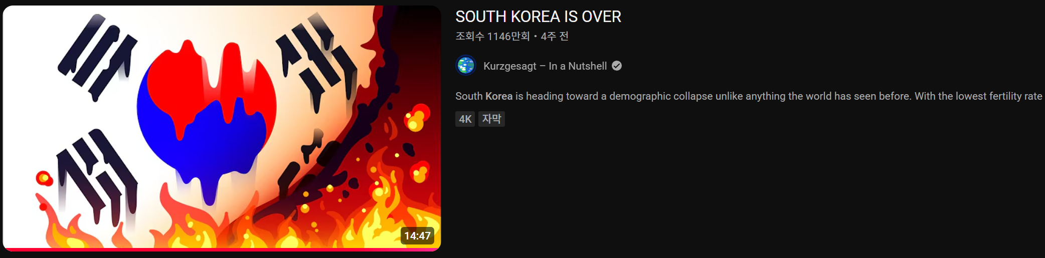 출산율, 고령화, 인구 절벽... 뉴스만 틀면 나오는 이야기죠. 특히 최근, 독일의 유명한 유튜브 채널인 쿠르트게작트에서 'South Korea is over' 라는 자극적인 제목으로 내놓은 영상이 1100만뷰를 넘기며 전세계적인 주목을 받아 대한민국의 인구 문제는 이제 국제적으로 공공연한 사실이 되었습니다. (영상은 굉장히 논리적으로 대한민국의 2060년을 예상합니다. 꼭 보시길 추천드려요)